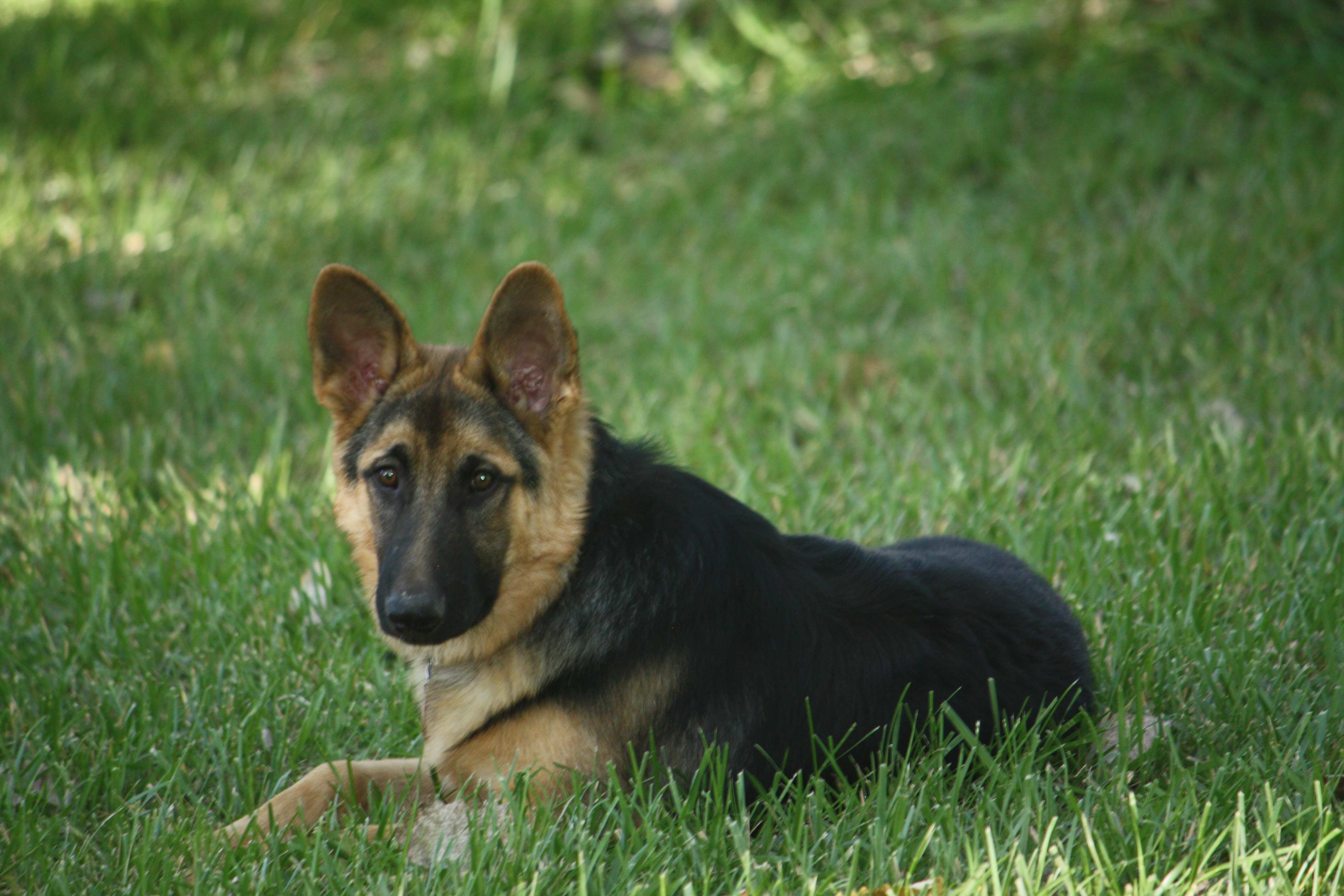 German Shepherds must have training. An untrained German Shepherd is likely to get into trouble. Good news! German Shepherds are easy to train because they are eager to work and learn! Puppies can begin formal puppy training after all puppy shots have been completed – as early as 4 months. We usually recommend that an owner allow a newly acquired adult dog to get used to the household rules for a month or so before starting formal dog classes. German Shepherds love the attention and “work” that training provides!